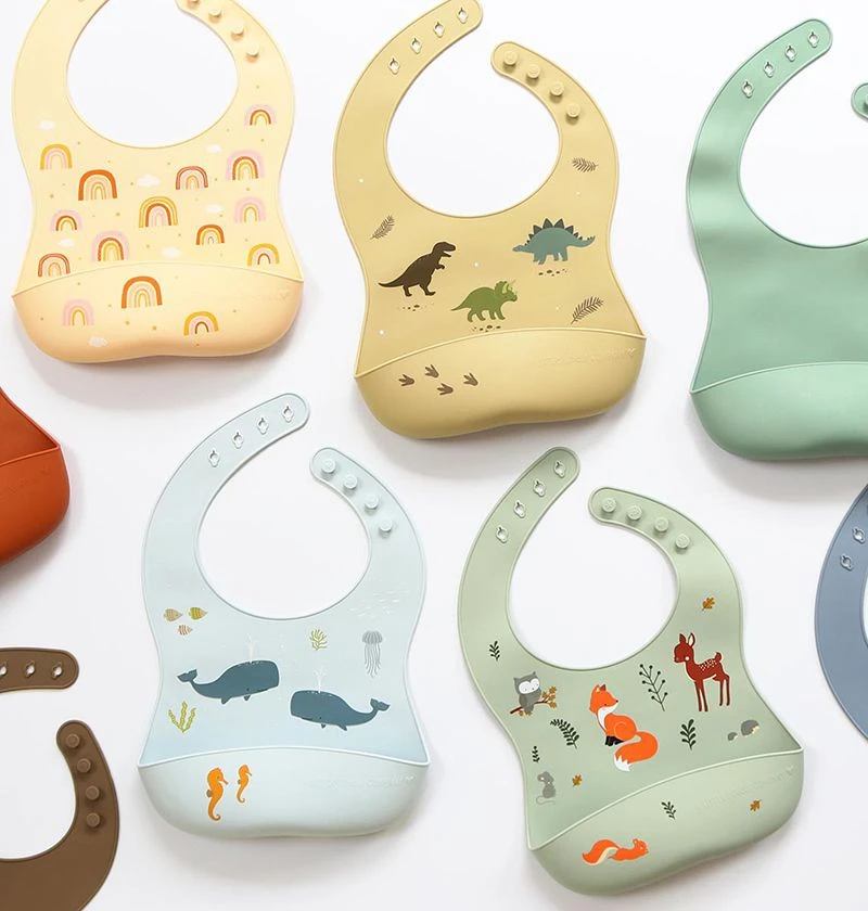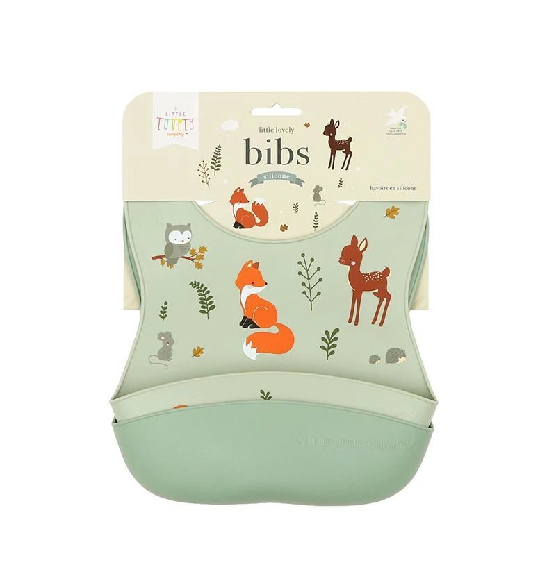 Set mit zwei Silikonlätzchen – eines mit Motiv Waldfreunde und ein weiteres farblich passend in uni. Die Lätzchen bestehen aus weichem, lebensmittelechtem und BPA-freiem Silikon. Sie sind wasser- und schmutzabweisend. Eine breite Auffangschale vermeidet, dass kleine und große Kleckereien auf dem Boden landen. Durch den verstellbaren Verschluss im Nacken eigenen sie sich für Babys und Kleinkinder. Die Silikonlätzchen von A Little Lovely Company sind leicht zu reinigen und durch Aufrollen leicht zu verstauen.