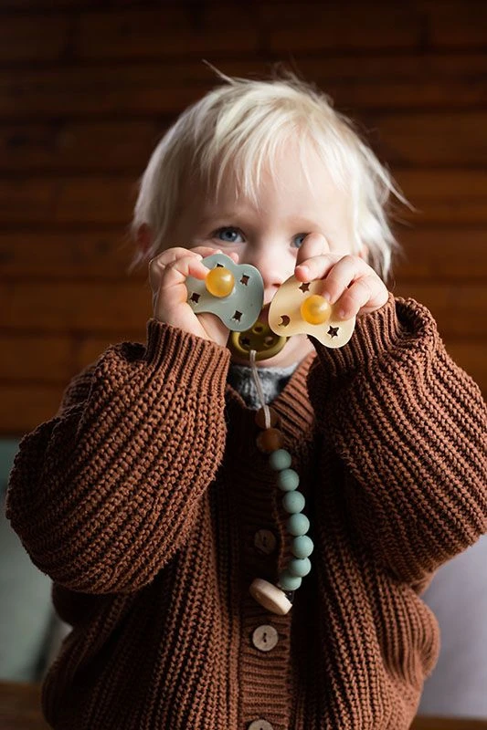 Unsere schönen HEVEA Schnullerketten sind handgefertigt und vegan. Sie bestehen aus 9 weichen Naturkautschukperlen, die mit einem starken, nickelfreien Holzclip befestigt werden, so sind sie sicher für kleine Knabberer und wunderbar anzufühlen für kleine Händchen. Die Perlen aus Naturkautschuk sind weich und flexibel, aber robust genug für die ersten Zähne. Der nickelfreie Clip wird in Deutschland hergestellt und ermöglicht eine leichte Befestigung an der Kleidung. Die Schnullerhalter sind in einer Reihe von sanften Farben erhältlich, die perfekt zu den Schnullern und Outfits der Saison passen! Die Produkte von HEVEA sind ideal für alle, die Plastik vermeiden und sich für nachhaltige Produkte entscheiden wollen.