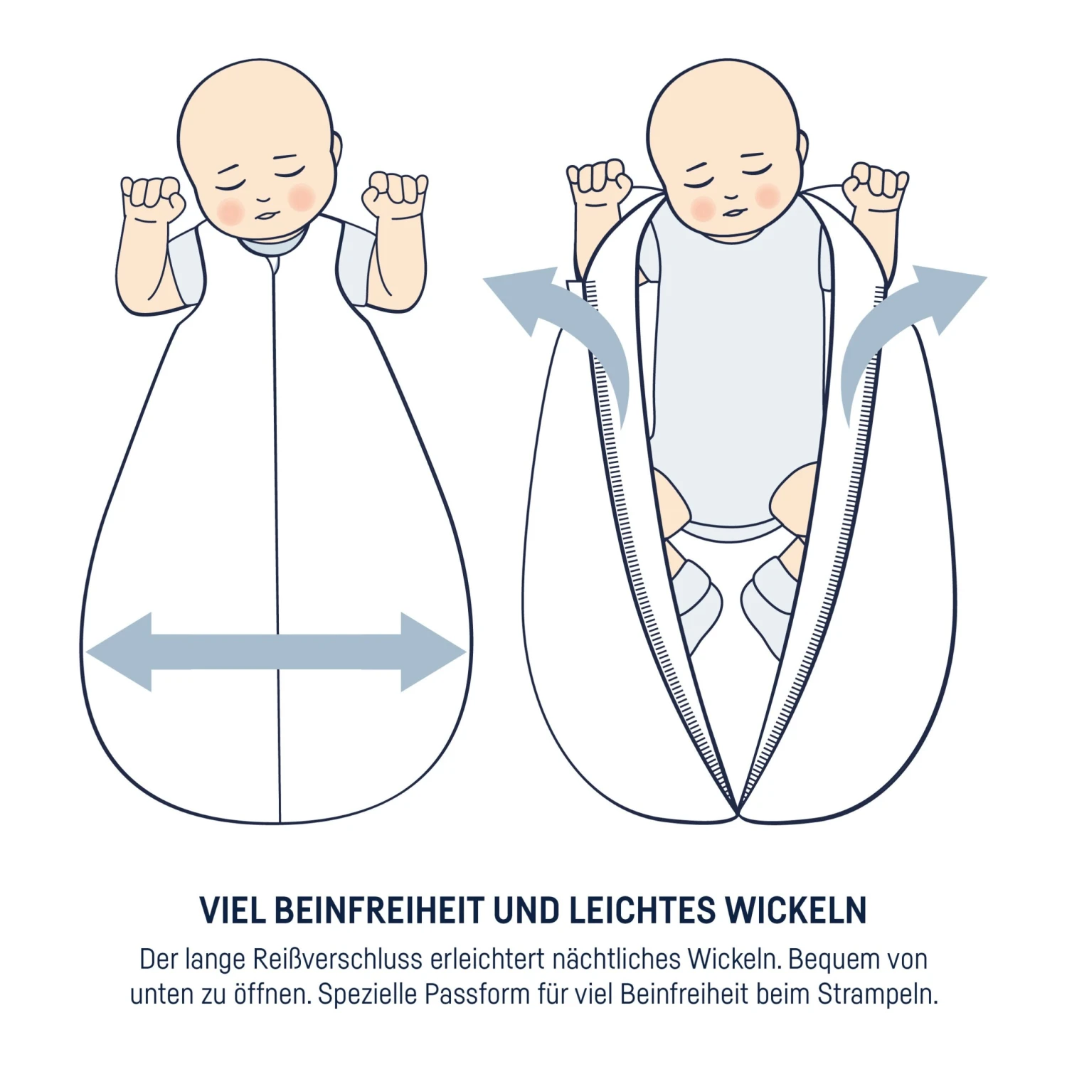 Der Babyschlafsack sollte möglichst passgenau sitzen und im Schulterbereich gut anliegen. Es sollten nicht weniger als 10cm Platz zwischen den Füßen und der Unterkante des Schlafsackes zur Verfügung stehen.