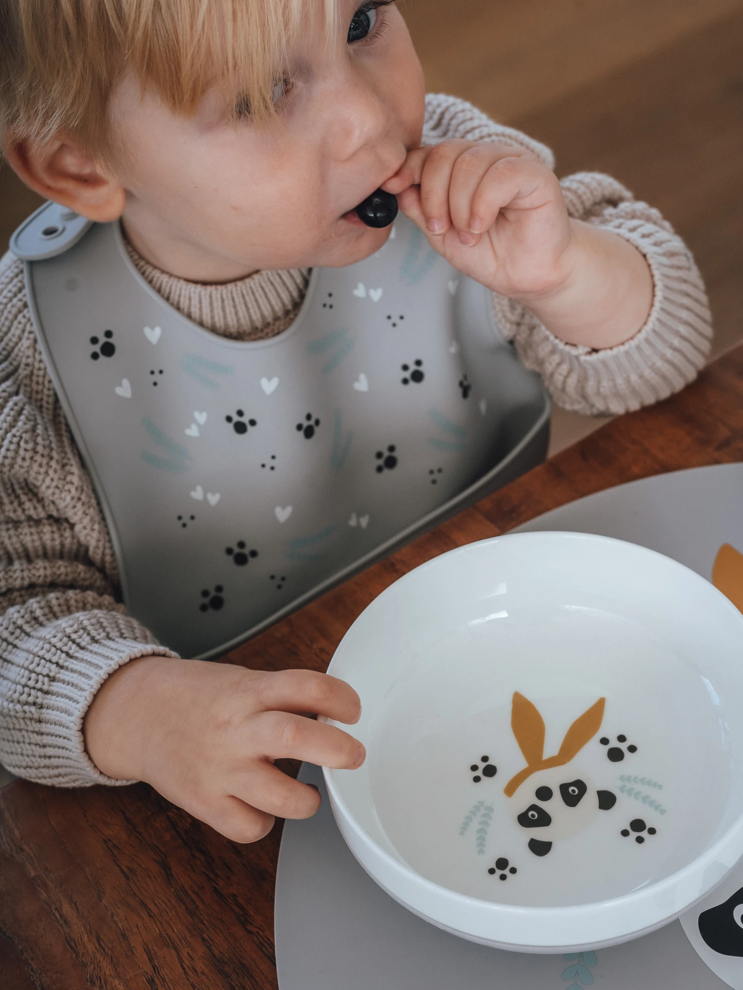 Die kindlich-verspielten Schalen machen den Kindern beim Essenlernen Spaß. Sie sind aus Weichporzellan mit sehr hoher Kantenschlagfestigkeit hergestellt und haben am Boden aufgedruckte Tiergesichter. Die dazugehörige Saugmatte aus 100% BPA-freiem Silikon sorgt dafür, dass die Schale nicht herunterfällt. Für grössere Kinder kann die Saugmatte auch einfach entfernt werden.