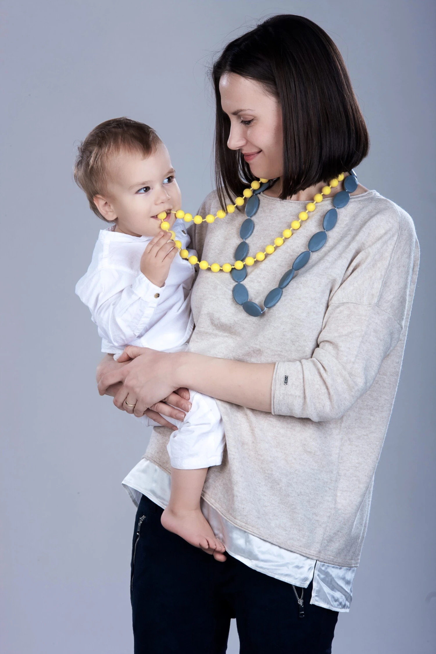 Mami’s müssen nicht mehr auf Schmuck verzichten, wenn sie ihr Baby auf dem Arm haben. Denn die Kleinsten lieben es, alles in den Mund zu nehmen, was sie ergreifen können. Vorallem, wenn die Zähnchen drücken. Jedoch Silberschmuck oder aus anderen Metallen ist für die kleinen Münder und Zähnchen nicht geeignet.
