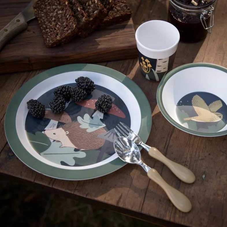 Auf dem flachen Teller ist eine Illustration von dem Igel Twinkle auf dem Waldboden mit Pilzen und heruntergefallenen Blättern zu sehen und am Boden des tiefen Tellers kann das Kind die Eule Nova entdecken, die im Dunkel der Nacht unterwegs ist. Auf der Tasse befindet sich ein Wiesel, das mitten in der Nacht im Wald unterwegs ist. Dieses Besteck ist so konzipiert, dass es sich für die kleinen Münder und Hände eignet. Das Besteck liegt gut in der Hand des Kindes, wodurch dem Kind das Erlernen der Technik erleichtert wird. Besteht aus Edelstahl mit Griffen aus Kunststoff.
